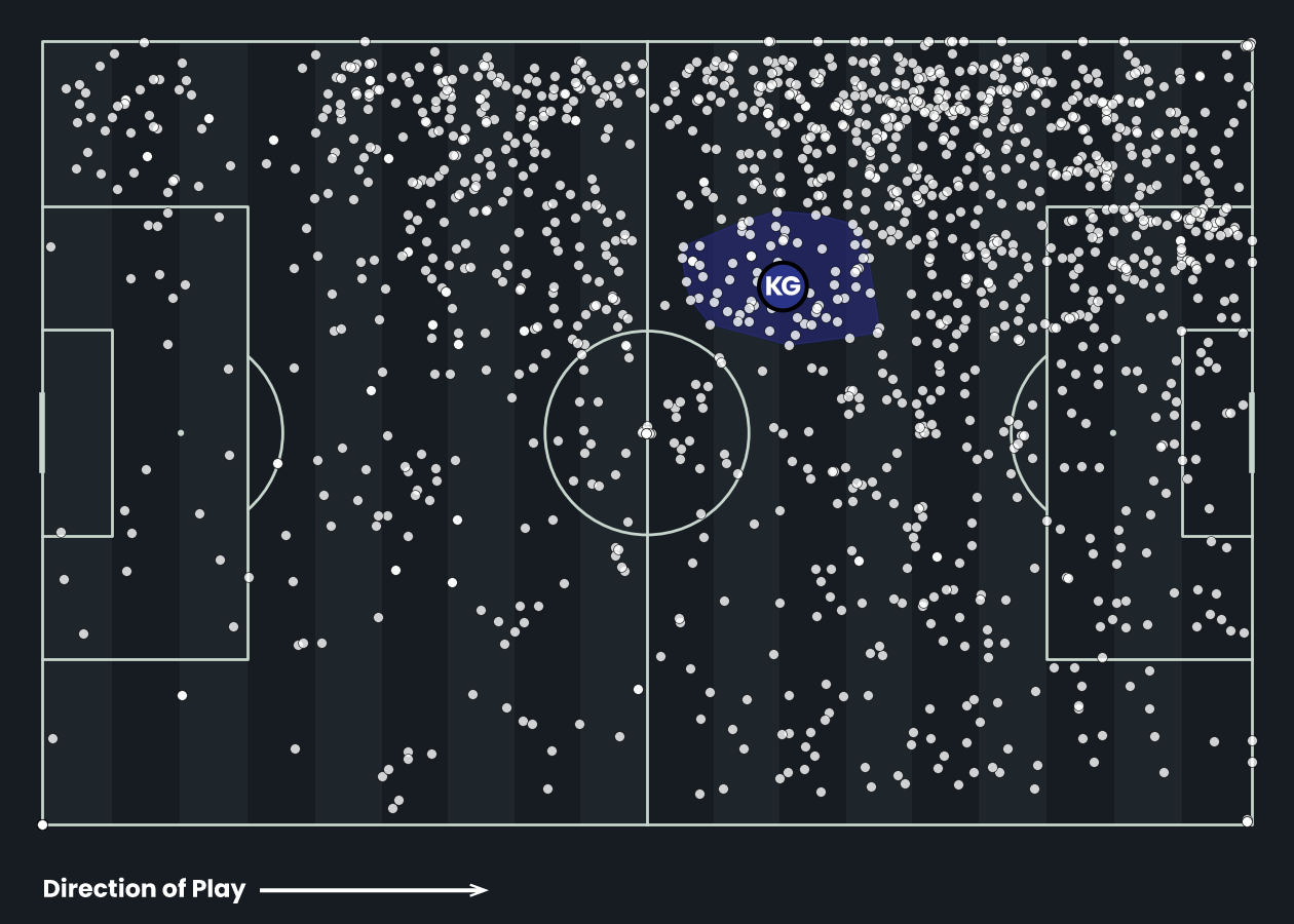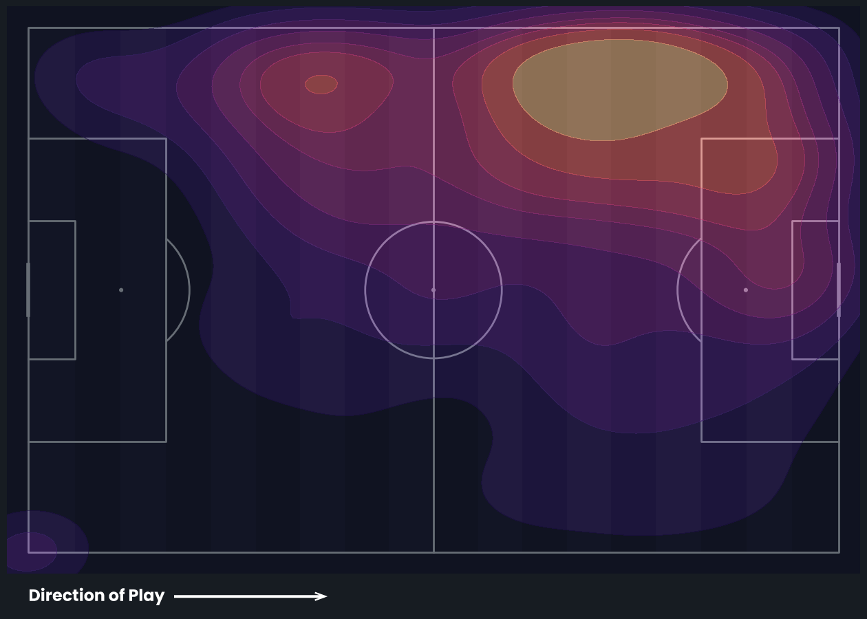 The highlighted area on the Touch Map shows the positions in which Grant most receives the ball and offers interesting insight into his play. Firstly, we see that he is a player who is able to drop into pockets of space deeper in midfield, serving as a conduit between defence and attack to facilitate build-up phases and progress the ball to the final third. Secondly, we can also see how Grant plays effectively as a progressive carrier, receiving the ball deep and moving vertically to high left-side areas through driving runs and short passing combinations.