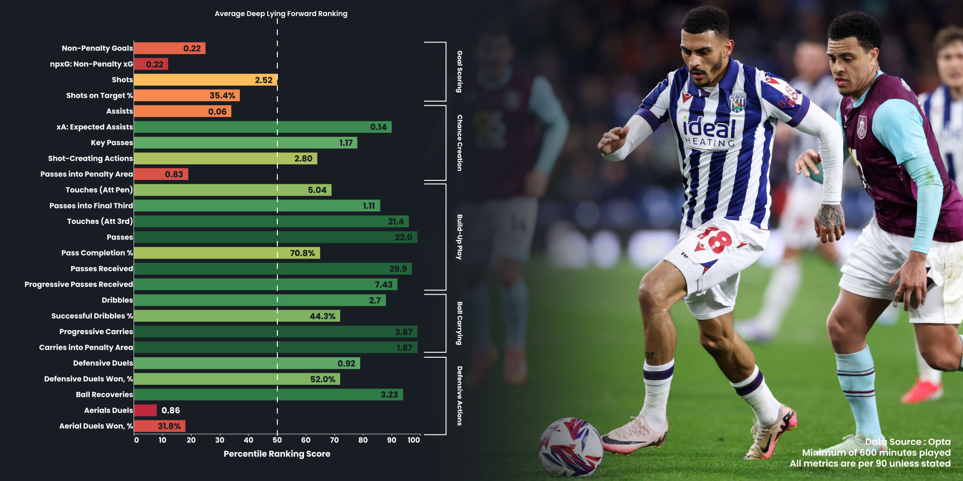 This is largely influenced by West Brom’s tactical setup and his deployment primarily on the left flank. Given his technical quality and composure in front of goal, these numbers would likely improve significantly if he were utilised more frequently in a central role, where he can operate closer to the opposition’s box and receive higher-value chances.