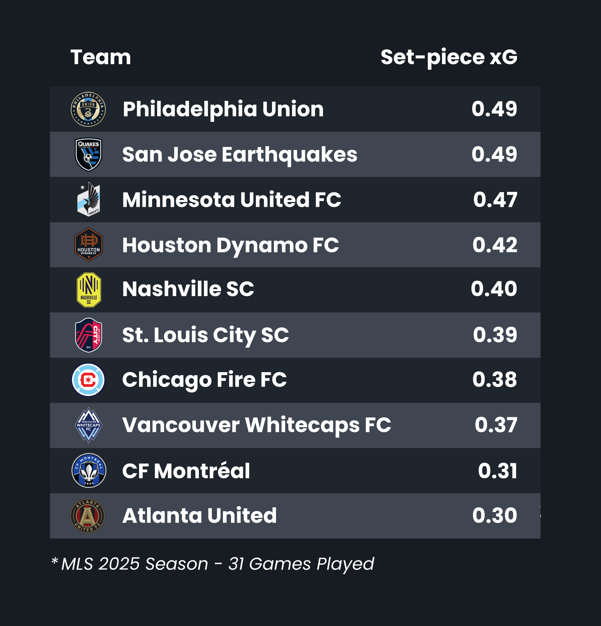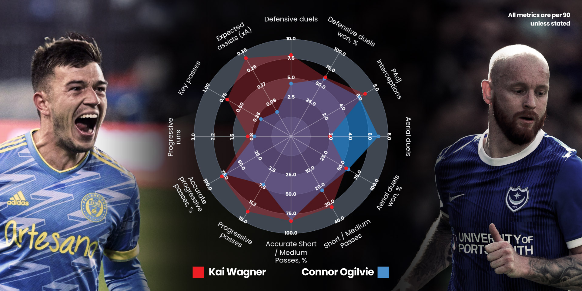 Kai Wagner delivers the majority of Philadelphia Union’s set-pieces, around 85 – 90% of corners and most wide free-kicks, helping drive their set-piece xG to 0.49 per game, compared to Portsmouth’s 0.38.