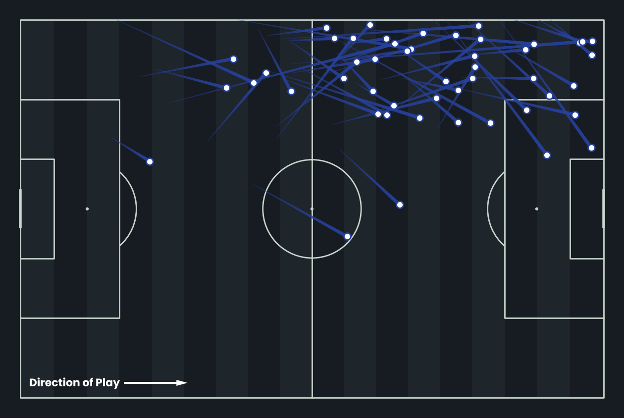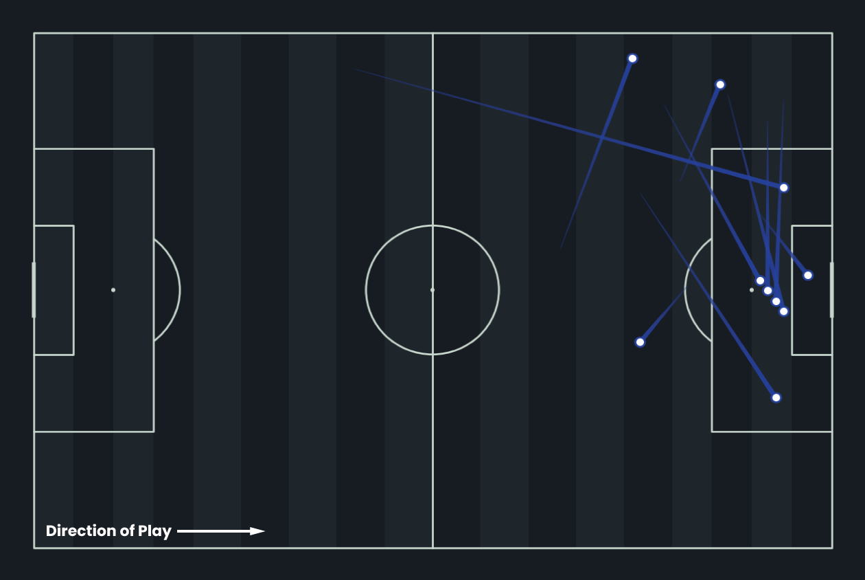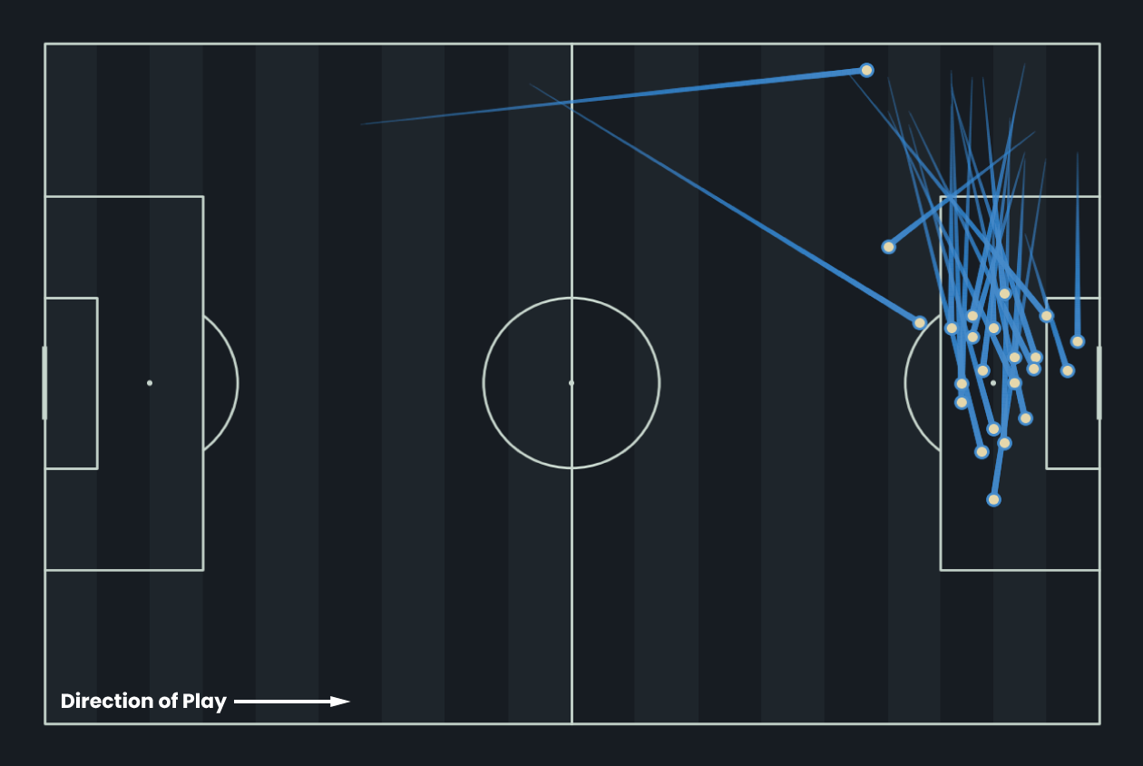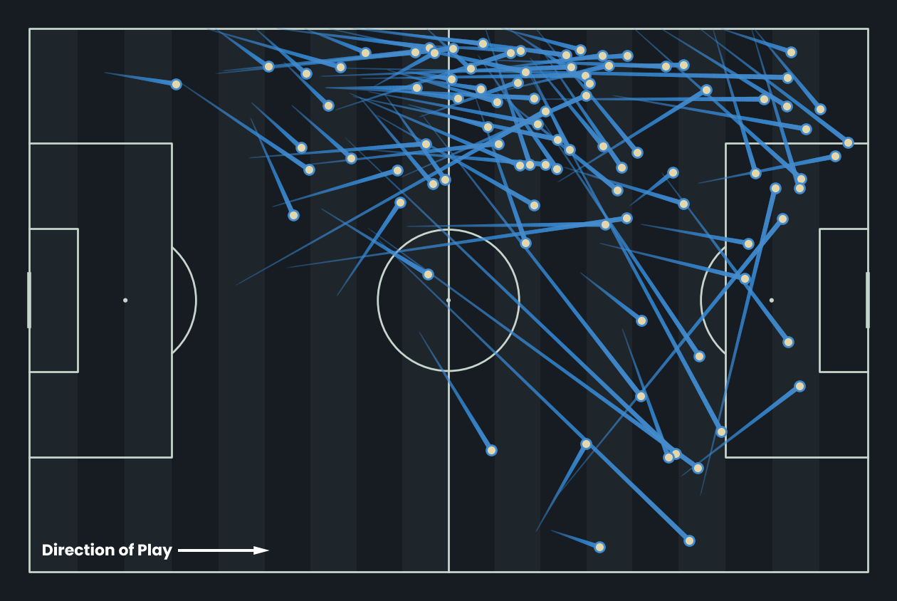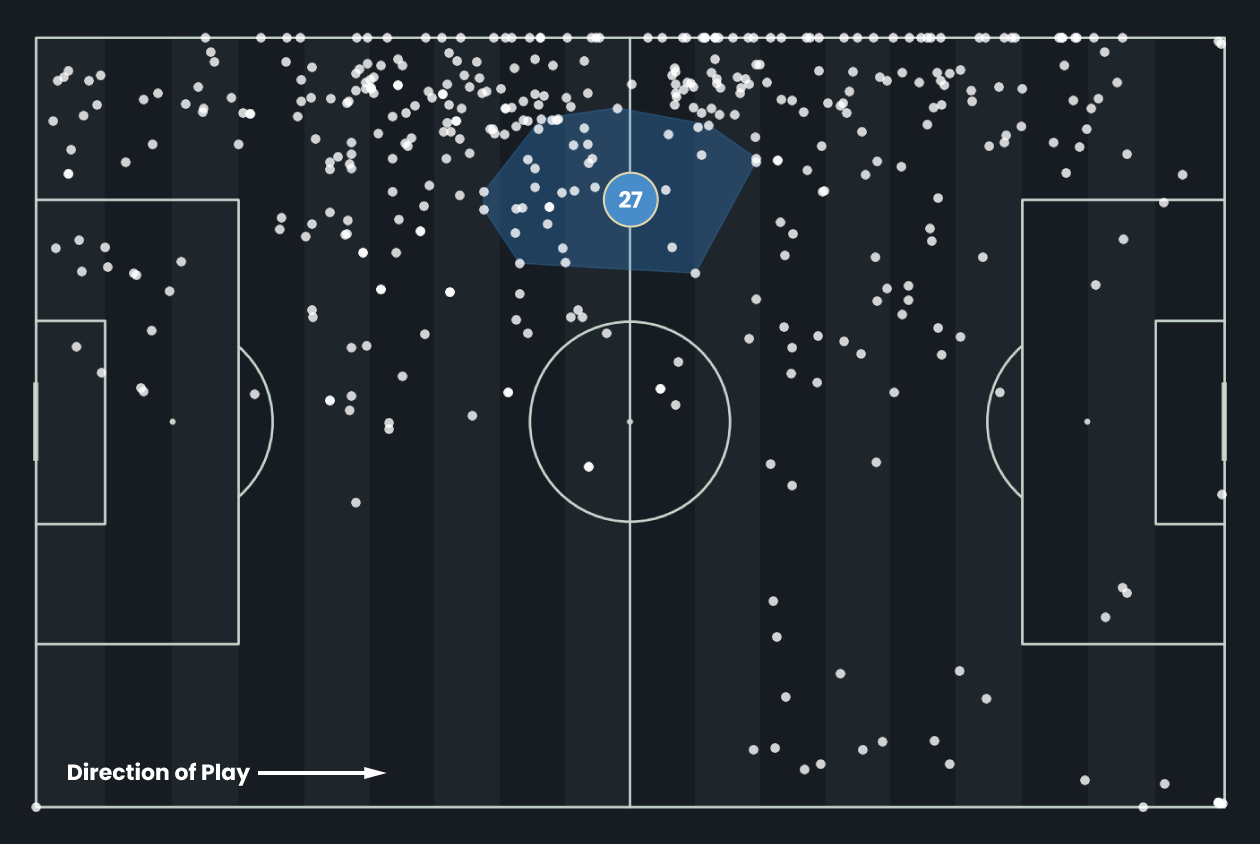 These are Kai Wagner’s 24 key passes from last season, each leading directly to a shot. Operating as a left-back, he consistently delivers into advanced areas, with the majority aimed at the edge of the box or into central attacking zones. His crossing and final-third passing make him a clear creative outlet, reflected in an xA of 0.32 per 90, one of the strongest outputs for his position. Wagner’s distribution underlines his value as an attacking full-back, offering consistent chance creation from the left side.