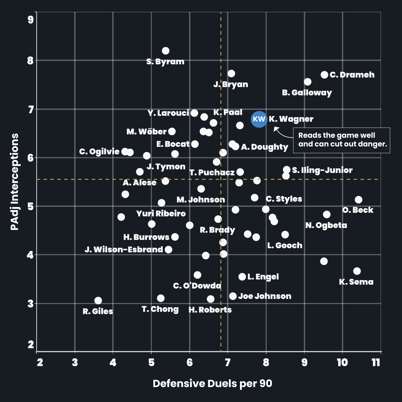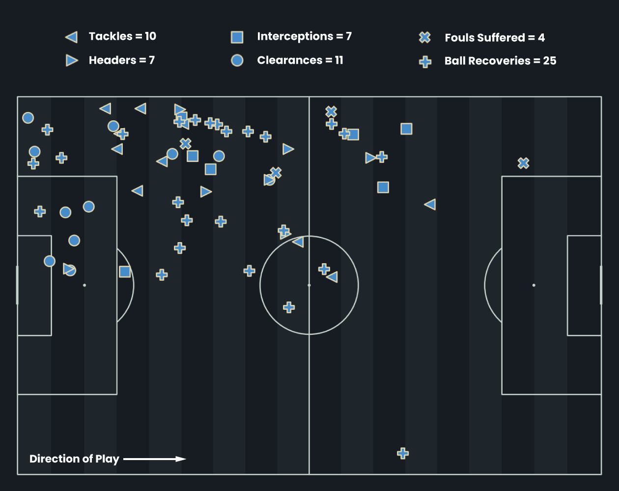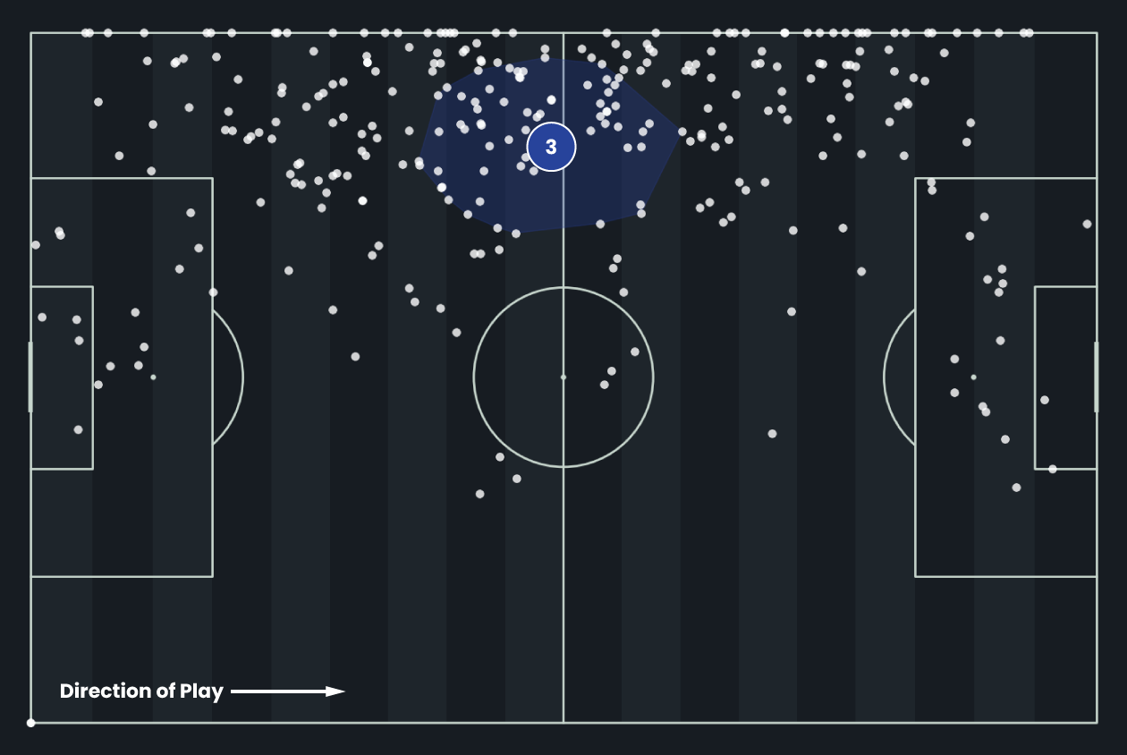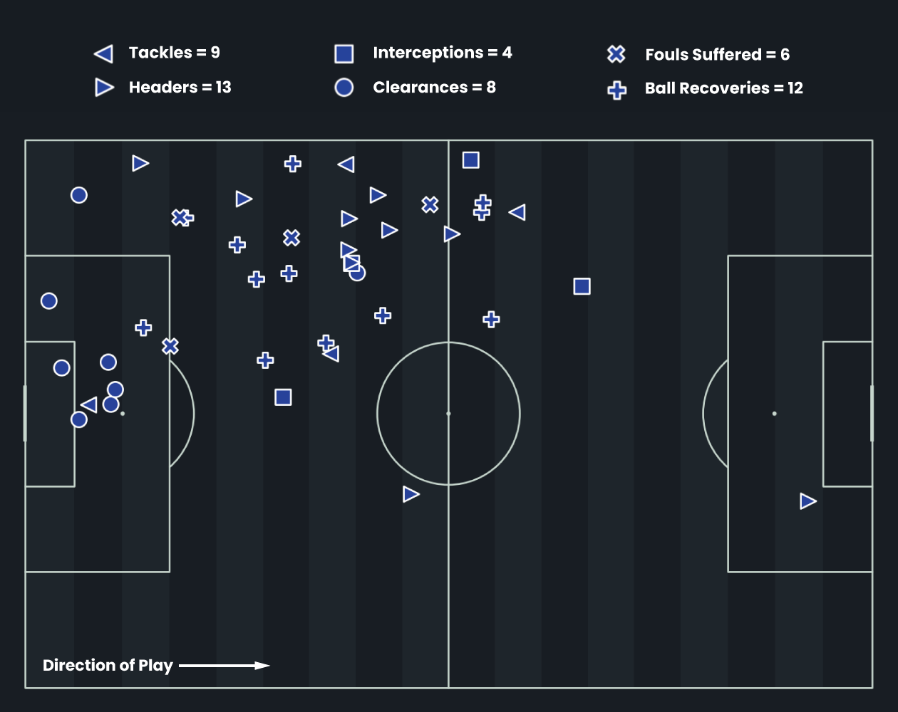 Wagner’s defensive actions are concentrated down the left flank, showing reliability in protecting his defensive channel while also stepping higher to press and disrupt wide attacks.