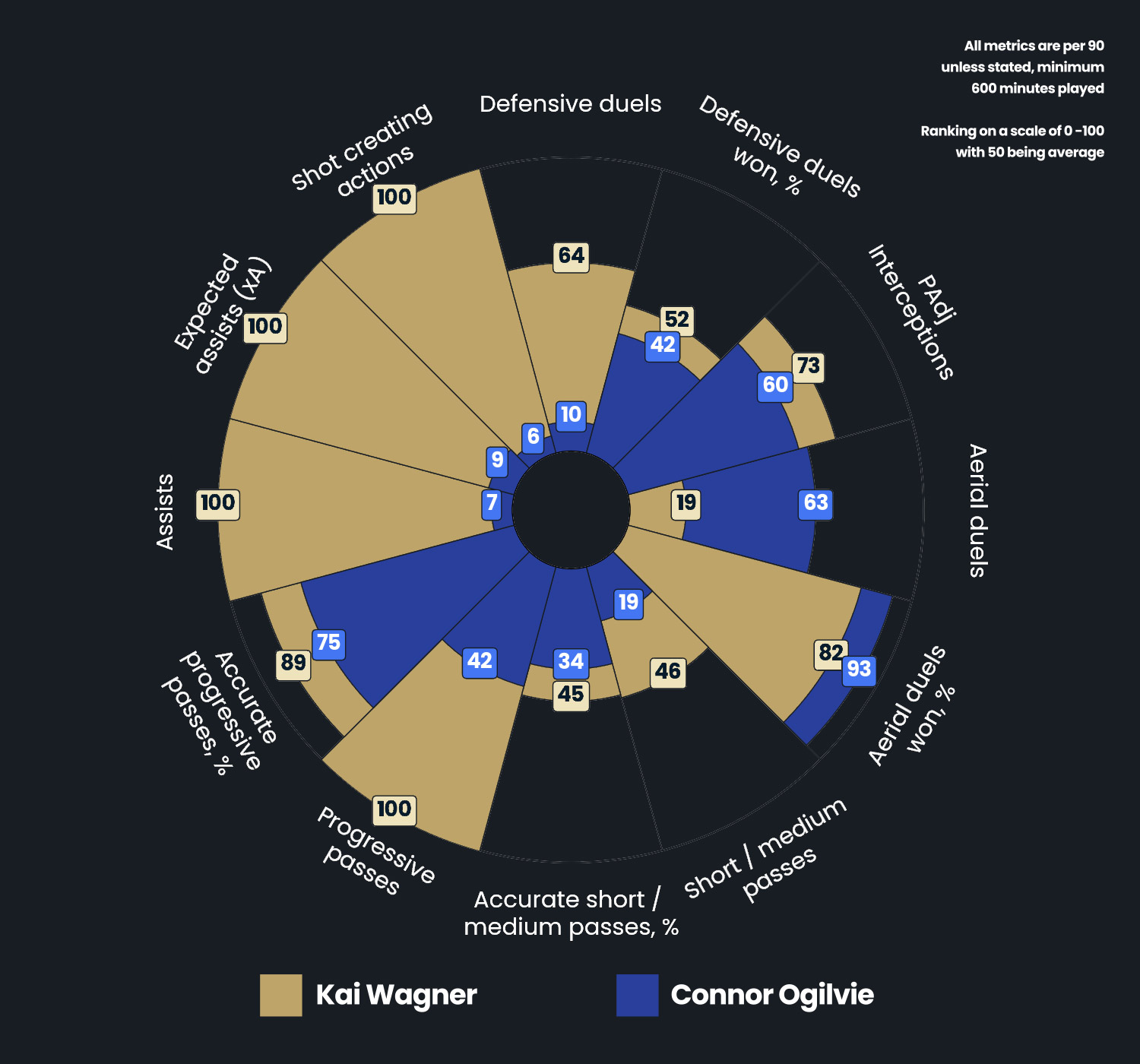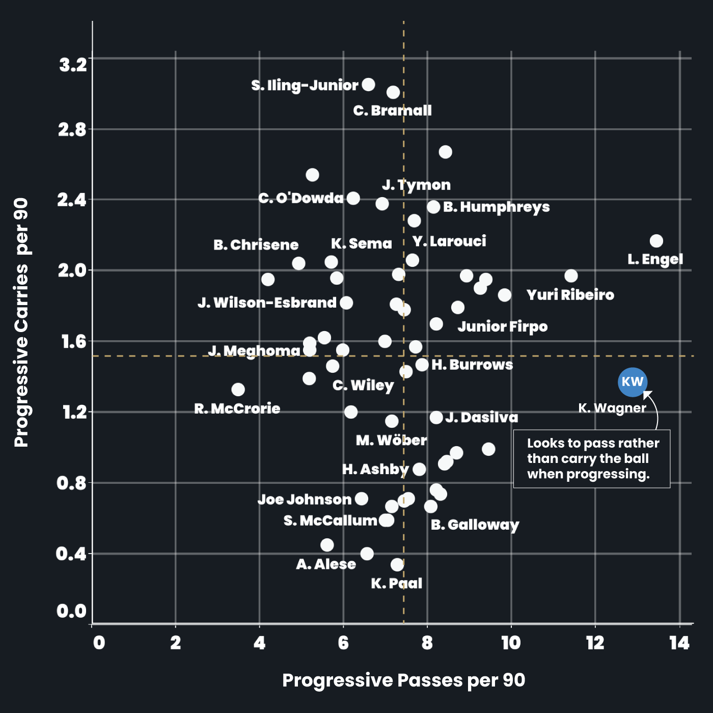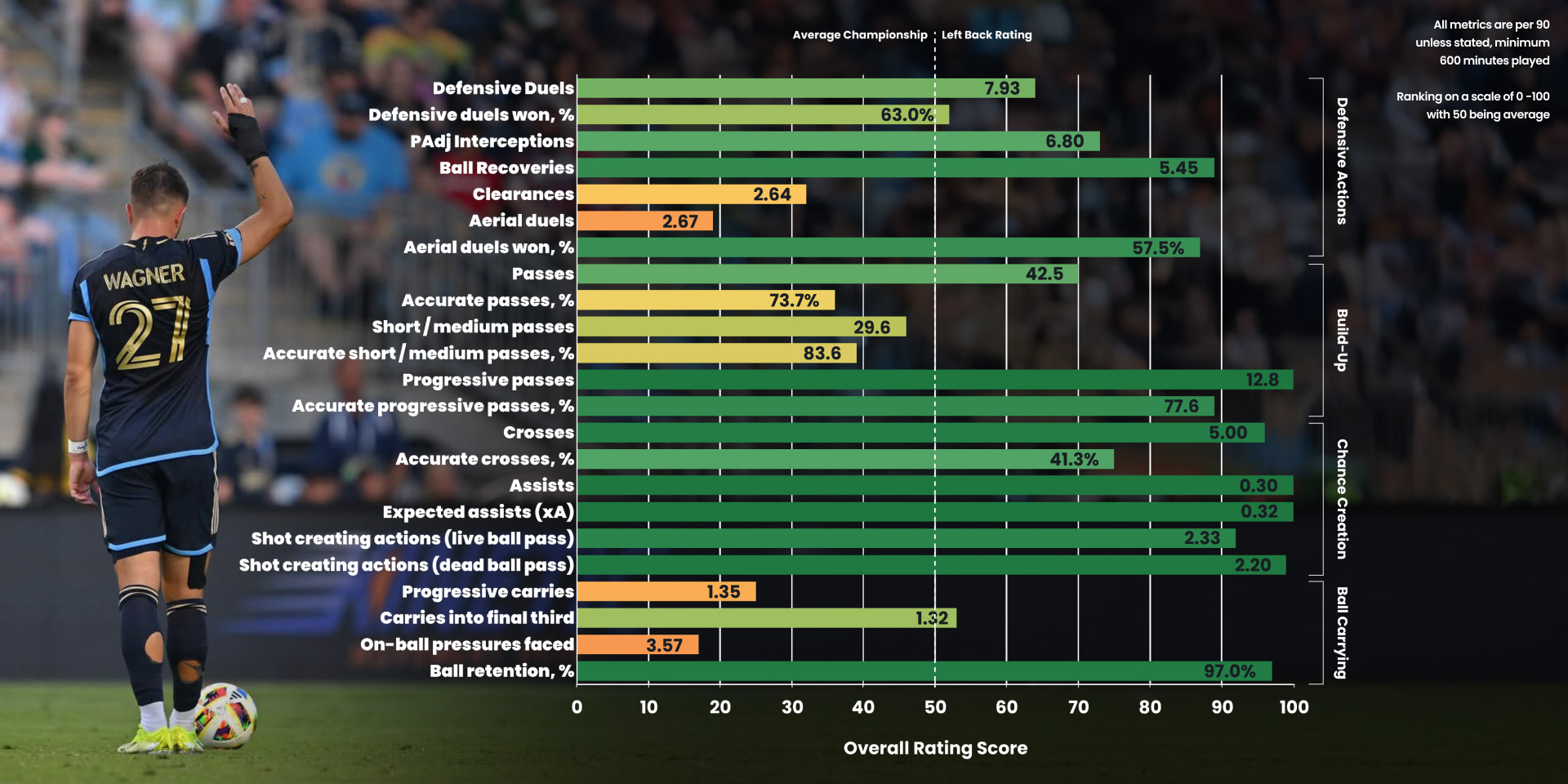 - Ball Carrying : 24/100 – Wagner focuses on build-up play and passing rather than ball carrying