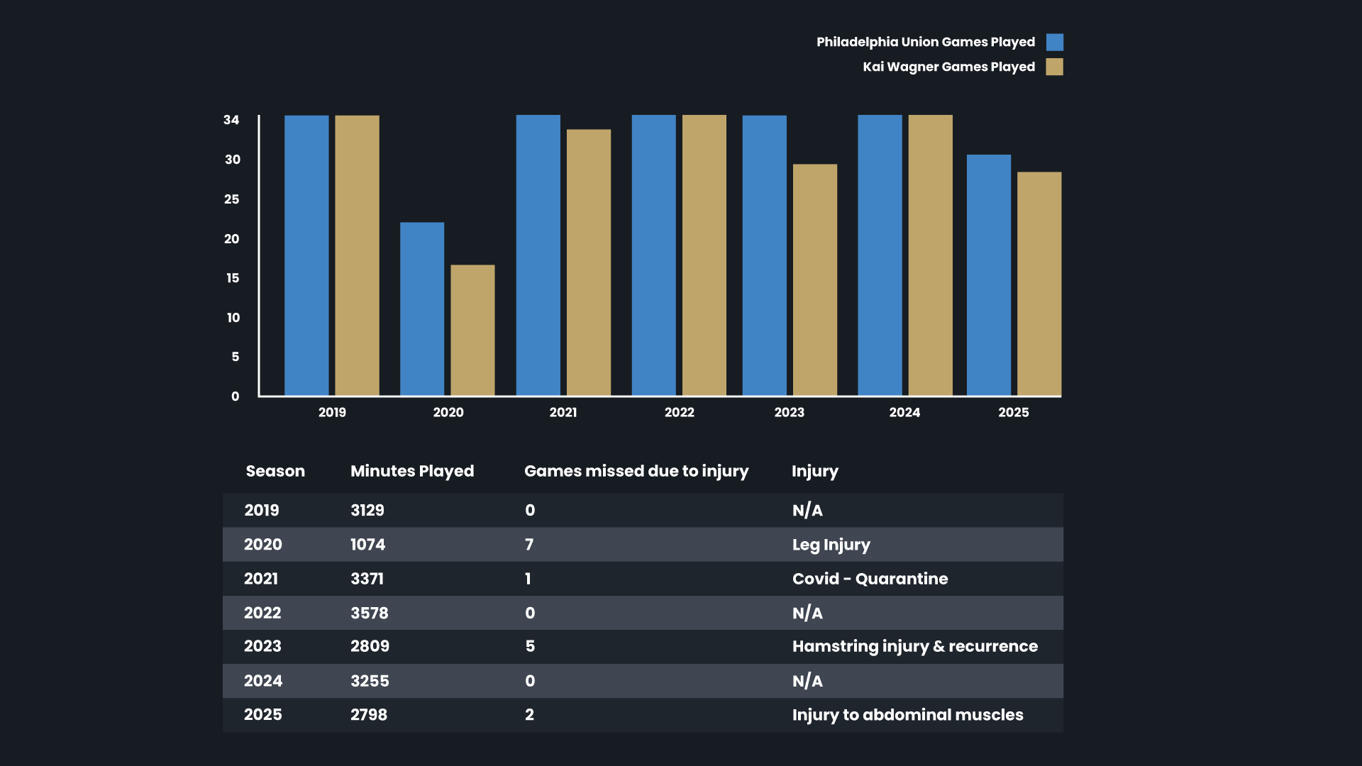 Since signing for Philadelphia Union, Kai Wagner has been available for 209 of 224 MLS matches, giving him an outstanding 93% availability rate. Over seven seasons he has missed just 15 league games, which is remarkable for a fullback in such a physically demanding role.